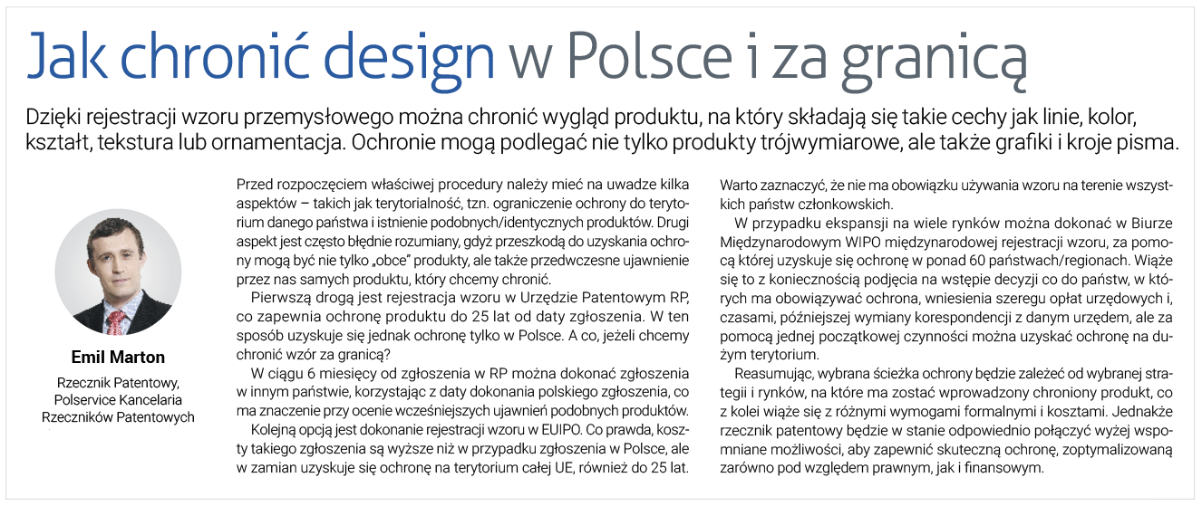 In der heutigen Ausgabe der "Dziennik Gazeta Prawna" wurde im Rahmen der Kampagne "Internationale Zusammenarbeit" ein Artikel unseres Kollegen Emil Marton über den Schutz von gewerblichen Mustern im In- und Ausland veröffentlicht.